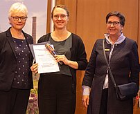 Dr. Annika F. Schowalter (Mitte) wurde mit dem Promotionspreis 2025 des Soroptimist-Clubs Bamberg Kunigunde ausgezeichnet. Glückwünsche überbrachten Prof. Dr. Heidrun Alzheimer (Jurymitglied) und die Club-Präsidentin Andrea Paletta (rechts). Foto: Emma Seeger/Universität Bamberg